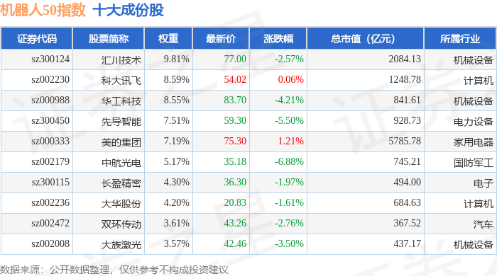 证券之星消息,10月30日,机器人50(399283)指数报收于4417.88点,跌2.47%,成交569.95亿元,换手率3.33%。当日该指数成份股中,上涨的有8家,航天智装以1.69%的涨幅领涨,下跌的有42家,中航光电以6.88%的跌幅领跌。