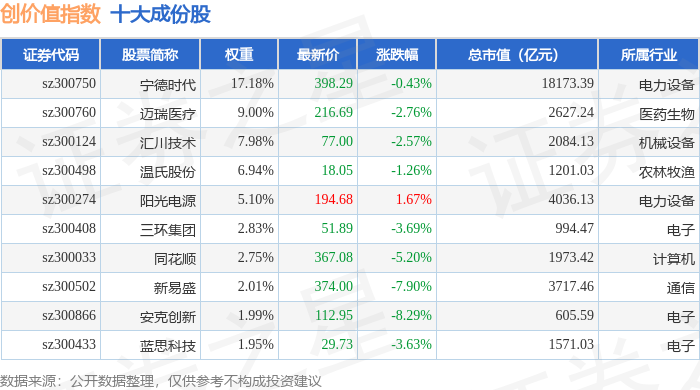 证券之星消息,10月30日,创价值(399295)指数报收于5592.98点,跌2.0%,成交1528.45亿元,换手率2.98%。当日该指数成份股中,上涨的有8家,欣旺达以10.14%的涨幅领涨,下跌的有42家,天孚通信以11.56%的跌幅领跌。