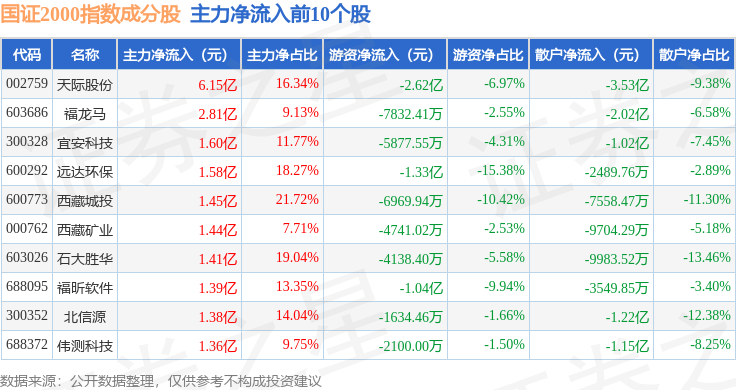 资金流向方面,国证2000(399303)指数成份股当日主力资金净流出合计294.72亿元,游资资金净流入合计70.03亿元,散户资金净流入合计224.69亿元。成份股资金流向详情见下表: