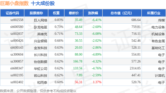 证券之星消息,10月30日,巨潮小盘(399316)指数报收于5925.94点,跌1.19%,成交3669.52亿元,换手率2.39%。当日该指数成份股中,上涨的有116家,鹏辉能源以20.0%的涨幅领涨,下跌的有376家,火炬电子以9.74%的跌幅领跌。