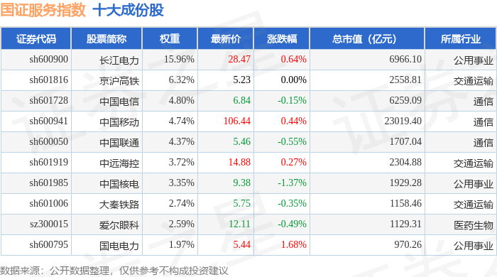 证券之星消息,10月30日,国证服务(399320)指数报收于2236.52点,涨0.19%,成交498.73亿元,换手率0.83%。当日该指数成份股中,上涨的有44家,招商轮船以10.02%的涨幅领涨,下跌的有53家,海峡股份以4.07%的跌幅领跌。