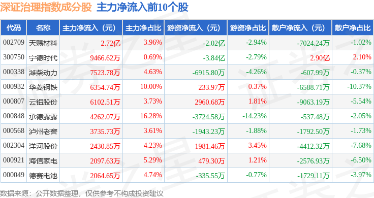 资金流向方面,深证治理(399328)指数成份股当日主力资金净流出合计67.34亿元,游资资金净流入合计17.82亿元,散户资金净流入合计49.52亿元。成份股资金流向详情见下表: