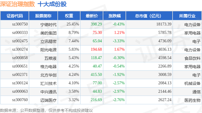 证券之星消息,10月30日,深证治理(399328)指数报收于11434.08点,跌0.77%,成交1178.72亿元,换手率1.79%。当日该指数成份股中,上涨的有13家,天赐材料以4.97%的涨幅领涨,下跌的有27家,中航光电以6.88%的跌幅领跌。