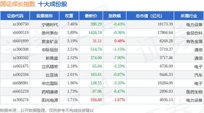 证券之星消息,10月30日,国证成长(399370)指数报收于5092.95点,跌1.24%,成交5817.62亿元,换手率1.78%。当日该指数成份股中,上涨的有99家,天华新能以14.69%的涨幅领涨,下跌的有230家,天孚通信以11.56%的跌幅领跌。