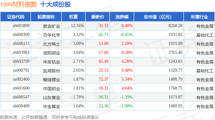 证券之星消息,10月30日,1000材料(399382)指数报收于3516.95点,涨0.35%,成交1961.55亿元,换手率2.42%。当日该指数成份股中,上涨的有58家,永兴材料以10.01%的涨幅领涨,下跌的有77家,菲利华以7.39%的跌幅领跌。