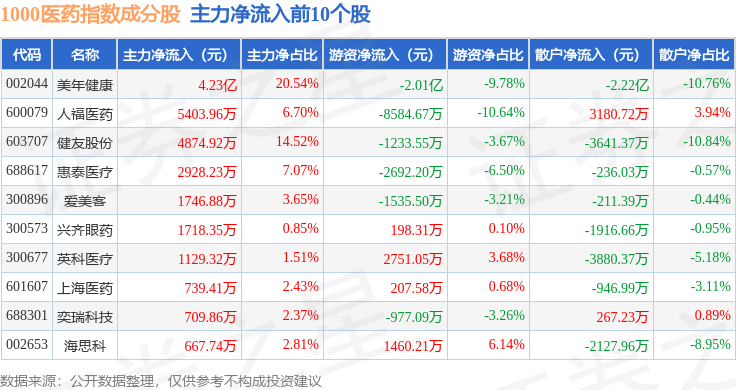 资金流向方面,1000医药(399386)指数成份股当日主力资金净流出合计33.45亿元,游资资金净流入合计12.14亿元,散户资金净流入合计21.31亿元。成份股资金流向详情见下表: