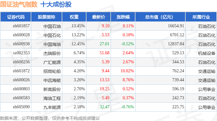 证券之星消息,10月30日,国证油气(399439)指数报收于1802.22点,涨0.89%,成交199.79亿元,换手率0.75%。当日该指数成份股中,上涨的有20家,招商轮船以10.02%的涨幅领涨,下跌的有29家,新天然气以4.02%的跌幅领跌。