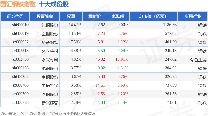 证券之星消息,10月30日,国证钢铁(399440)指数报收于1442.24点,涨1.28%,成交183.18亿元,换手率2.27%。当日该指数成份股中,上涨的有22家,永兴材料以10.01%的涨幅领涨,下跌的有17家,哈焊华通以6.08%的跌幅领跌。