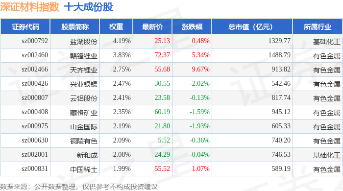 证券之星消息,10月30日,深证材料(399614)指数报收于3423.99点,涨0.45%,成交1277.65亿元,换手率2.69%。当日该指数成份股中,上涨的有45家,永兴材料以10.01%的涨幅领涨,下跌的有66家,菲利华以7.39%的跌幅领跌。
