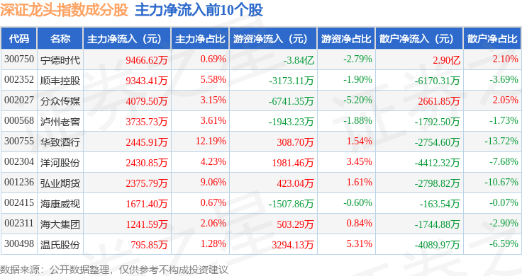 资金流向方面,深证龙头(399653)指数成份股当日主力资金净流出合计88.41亿元,游资资金净流入合计26.55亿元,散户资金净流入合计61.85亿元。成份股资金流向详情见下表: