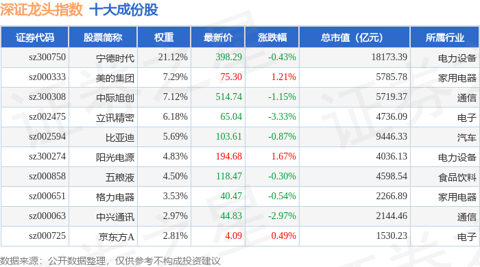 证券之星消息,10月30日,深证龙头(399653)指数报收于3133.91点,跌0.66%,成交1434.63亿元,换手率1.42%。当日该指数成份股中,上涨的有11家,华利集团以2.75%的涨幅领涨,下跌的有39家,瑞达期货以7.39%的跌幅领跌。
