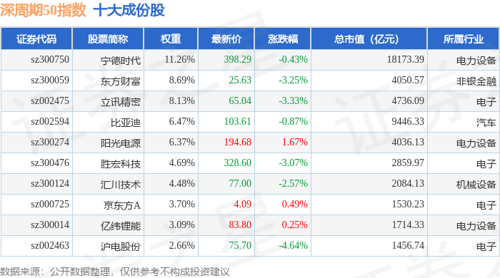 证券之星消息,10月30日,深周期50(399670)指数报收于4511.27点,跌1.0%,成交1810.59亿元,换手率1.97%。当日该指数成份股中,上涨的有17家,天齐锂业以9.67%的涨幅领涨,下跌的有33家,中航光电以6.88%的跌幅领跌。