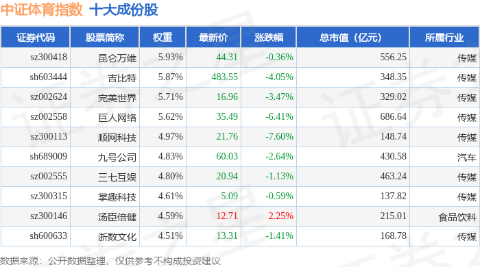 证券之星消息,10月30日,中证体育(399804)指数报收于2010.85点,跌1.99%,成交215.58亿元,换手率3.5%。当日该指数成份股中,上涨的有6家,华利集团以2.75%的涨幅领涨,下跌的有34家,顺网科技以7.6%的跌幅领跌。