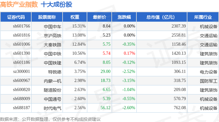 高铁产业(399807)指数十大成份股详情如下: