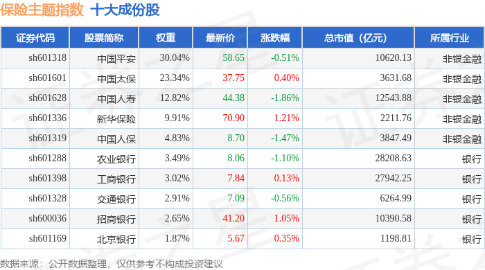保险主题(399809)指数十大成份股详情如下: