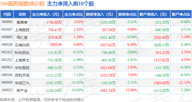 资金流向方面,300医药(399913)指数成份股当日主力资金净流出合计28.85亿元,游资资金净流入合计9.5亿元,散户资金净流入合计19.35亿元。成份股资金流向详情见下表: