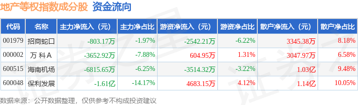资金流向方面,地产等权(399983)指数成份股当日主力资金净流出合计2.74亿元,游资资金净流出合计768.43万元,散户资金净流入合计2.82亿元。成份股资金流向详情见下表: