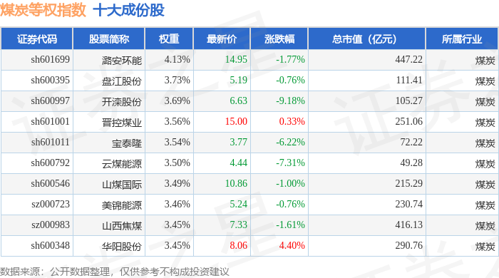 资金流向方面,煤炭等权(399990)指数成份股当日主力资金净流出合计7.27亿元,游资资金净流出合计1.42亿元,散户资金净流入合计8.7亿元。成份股资金流向详情见下表: