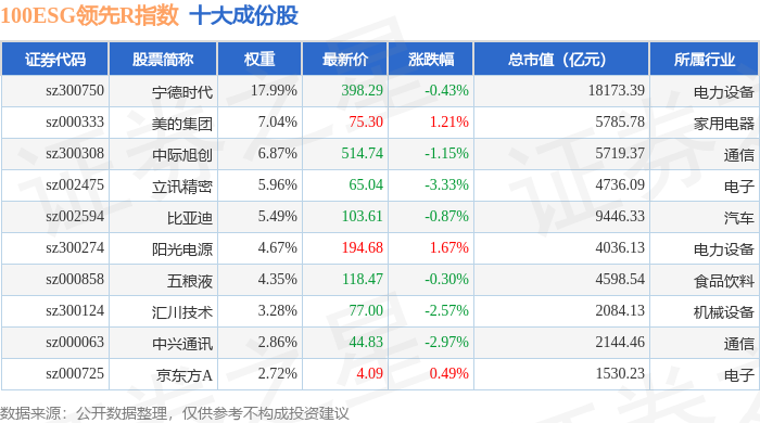 证券之星消息,10月30日,100ESG领先R(470030)指数报收于9555.11点,跌0.66%,成交1903.92亿元,换手率1.6%。当日该指数成份股中,上涨的有14家,天齐锂业以9.67%的涨幅领涨,下跌的有36家,中航光电以6.88%的跌幅领跌。