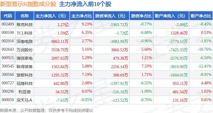 资金流向方面,新型显示R(470048)指数成份股当日主力资金净流出合计41.55亿元,游资资金净流入合计10.82亿元,散户资金净流入合计30.72亿元。成份股资金流向详情见下表: