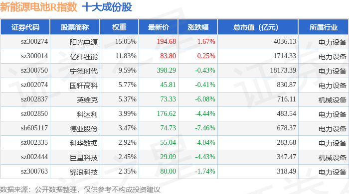 证券之星消息,10月30日,新能源电池R(480027)指数报收于3798.71点,跌0.45%,成交959.47亿元,换手率3.94%。当日该指数成份股中,上涨的有21家,鹏辉能源以20.0%的涨幅领涨,下跌的有29家,申菱环境以12.91%的跌幅领跌。