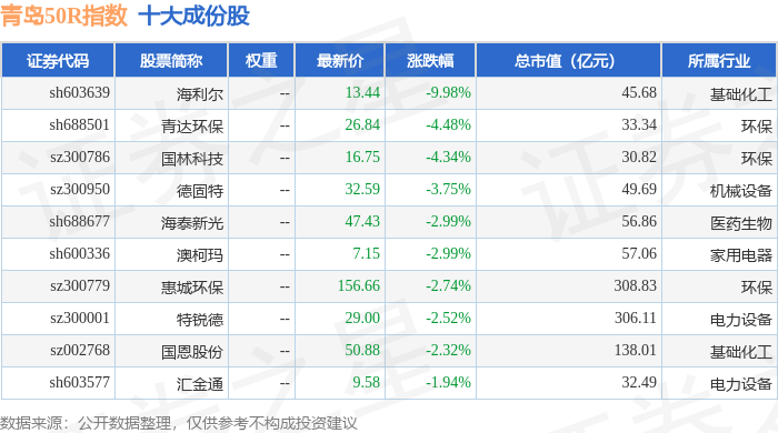 青岛50R(489011)指数十大成份股详情如下: