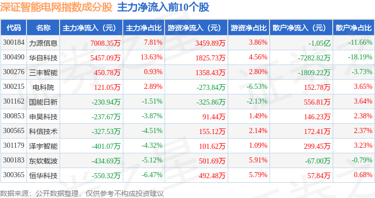 资金流向方面,深证智能电网(970054)指数成份股当日主力资金净流出合计40.74亿元,游资资金净流入合计8.44亿元,散户资金净流入合计32.29亿元。成份股资金流向详情见下表: