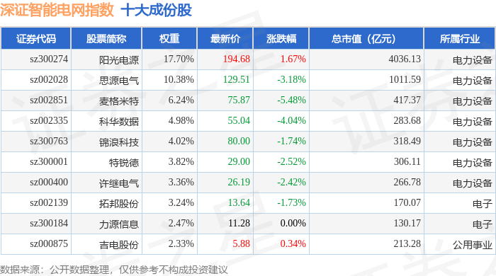 证券之星消息,10月30日,深证智能电网(970054)指数报收于3942.01点,跌1.6%,成交556.96亿元,换手率4.71%。当日该指数成份股中,上涨的有7家,新雷能以11.97%的涨幅领涨,下跌的有42家,明阳电气以10.04%的跌幅领跌。