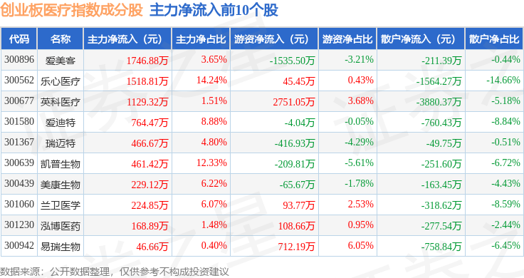 资金流向方面,创业板医疗(970082)指数成份股当日主力资金净流出合计9.54亿元,游资资金净流入合计4.24亿元,散户资金净流入合计5.3亿元。成份股资金流向详情见下表: