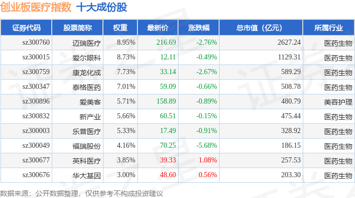 证券之星消息,10月30日,创业板医疗(970082)指数报收于3878.92点,跌1.43%,成交165.31亿元,换手率1.88%。当日该指数成份股中,上涨的有9家,可孚医疗以4.94%的涨幅领涨,下跌的有41家,健帆生物以5.73%的跌幅领跌。