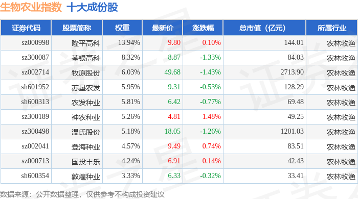 生物农业(980072)指数十大成份股详情如下: