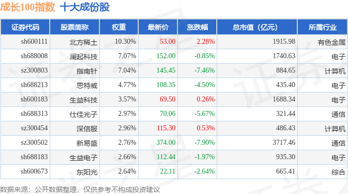 成长100(980080)指数十大成份股详情如下: