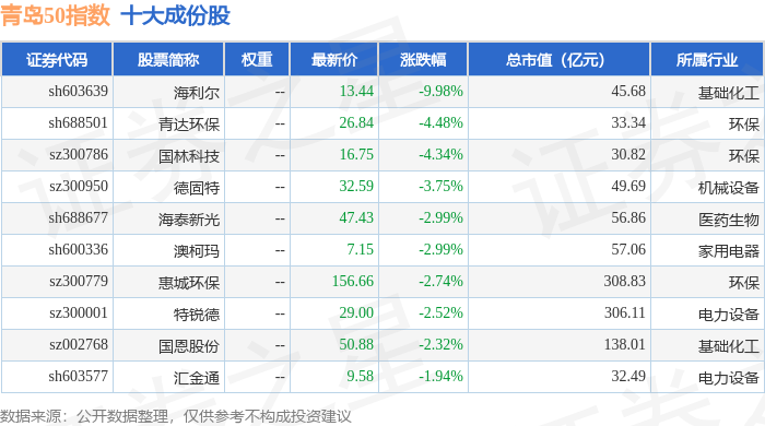 证券之星消息,10月30日,青岛50(989011)指数报收于2406.93点,跌0.39%,成交122.77亿元,换手率2.1%。当日该指数成份股中,上涨的有17家,天能重工以3.23%的涨幅领涨,下跌的有24家,海利尔以9.98%的跌幅领跌。