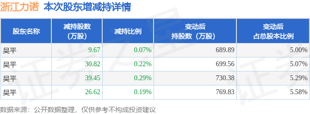 证券之星消息,10月30日浙江力诺发布公告《浙江力诺:关于持股5%以上股东持股比例变动至5%暨披露简式权益变动报告书的提示性公告》,其股东吴平于2025年10月23日至2025年10月28日间合计减持106.56万股,占公司目前总股本的0.7723%,变动期间该股股价上涨3.63%,截止10月28日收盘报15.42元。