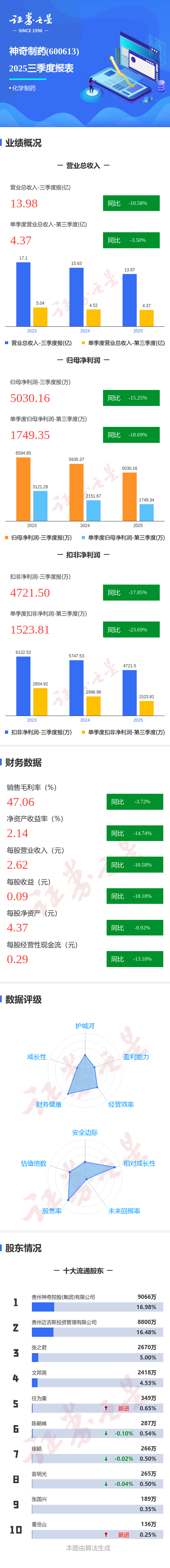 证券之星消息,神奇制药2025年三季报显示,前三季度公司主营收入13.98亿元,同比下降10.58%;归母净利润5030.16万元,同比下降15.25%;扣非净利润4721.5万元,同比下降17.85%;其中2025年第三季度,公司单季度主营收入4.37亿元,同比下降3.51%;单季度归母净利润1749.35万元,同比下降18.7%;单季度扣非净利润1523.81万元,同比下降23.69%;负债率21.93%,财务费用148.98万元,毛利率47.06%。