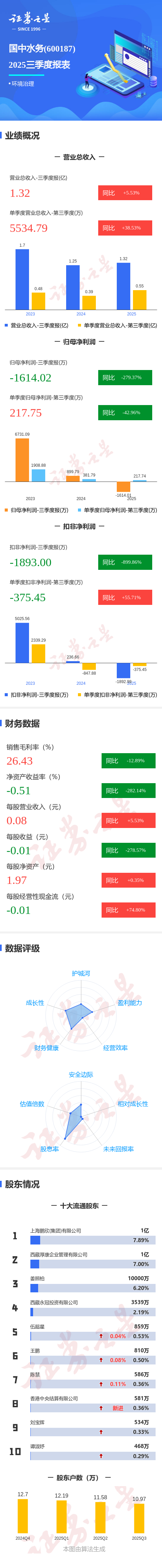 证券之星消息,国中水务2025年三季报显示,前三季度公司主营收入1.32亿元,同比上升5.53%;归母净利润-1614.02万元,同比下降279.38%;扣非净利润-1893.0万元,同比下降899.87%;其中2025年第三季度,公司单季度主营收入5534.79万元,同比上升38.54%;单季度归母净利润217.75万元,同比下降42.97%;单季度扣非净利润-375.45万元,同比上升55.72%;负债率8.17%,投资收益2721.37万元,财务费用196.15万元,毛利率26.43%。