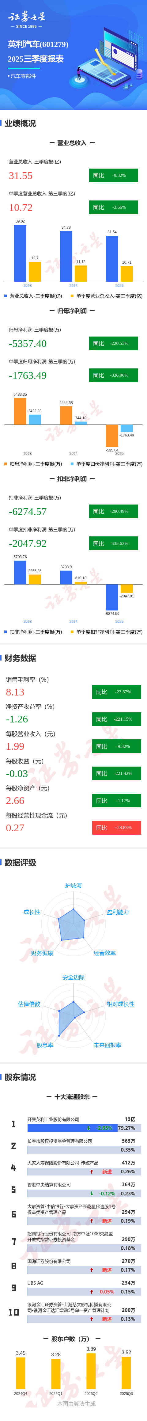 证券之星消息,英利汽车2025年三季报显示,前三季度公司主营收入31.55亿元,同比下降9.33%;归母净利润-5357.4万元,同比下降220.54%;扣非净利润-6274.57万元,同比下降290.49%;其中2025年第三季度,公司单季度主营收入10.72亿元,同比下降3.67%;单季度归母净利润-1763.49万元,同比下降336.97%;单季度扣非净利润-2047.92万元,同比下降435.62%;负债率39.12%,投资收益-419.23万元,财务费用1533.19万元,毛利率8.13%。