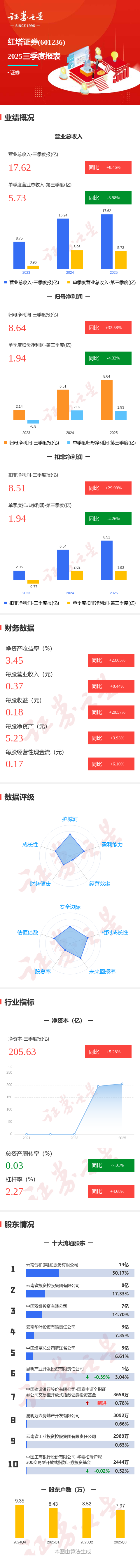 证券之星消息,红塔证券2025年三季报显示,前三季度公司主营收入17.62亿元,同比上升8.46%;归母净利润8.64亿元,同比上升32.59%;扣非净利润8.51亿元,同比上升30.0%;其中2025年第三季度,公司单季度主营收入5.73亿元,同比下降3.98%;单季度归母净利润1.94亿元,同比下降4.33%;单季度扣非净利润1.94亿元,同比下降4.27%;负债率55.99%,投资收益9.85亿元。