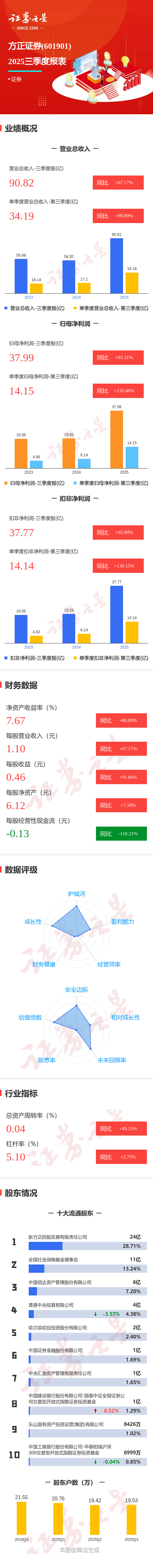 证券之星消息,方正证券2025年三季报显示,前三季度公司主营收入90.82亿元,同比上升67.17%;归母净利润37.99亿元,同比上升93.31%;扣非净利润37.77亿元,同比上升95.91%;其中2025年第三季度,公司单季度主营收入34.19亿元,同比上升99.89%;单季度归母净利润14.15亿元,同比上升130.46%;单季度扣非净利润14.14亿元,同比上升130.15%;负债率80.39%,投资收益33.51亿元。
