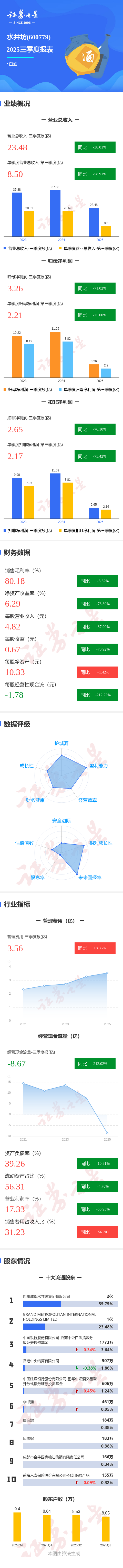 证券之星消息,水井坊2025年三季报显示,前三季度公司主营收入23.48亿元,同比下降38.01%;归母净利润3.26亿元,同比下降71.02%;扣非净利润2.65亿元,同比下降76.11%;其中2025年第三季度,公司单季度主营收入8.5亿元,同比下降58.91%;单季度归母净利润2.21亿元,同比下降75.01%;单季度扣非净利润2.17亿元,同比下降75.43%;负债率39.26%,财务费用-279.48万元,毛利率80.18%。