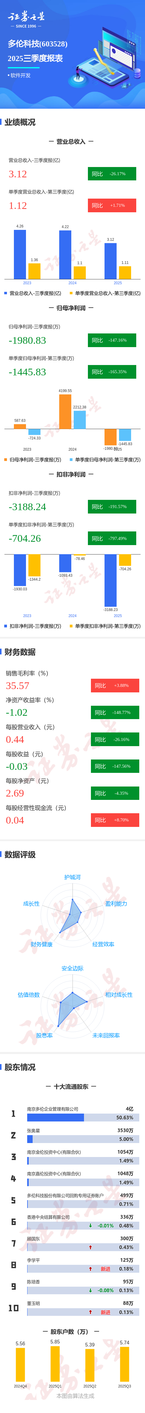 证券之星消息,多伦科技2025年三季报显示,前三季度公司主营收入3.12亿元,同比下降26.17%;归母净利润-1980.83万元,同比下降147.17%;扣非净利润-3188.24万元,同比下降191.58%;其中2025年第三季度,公司单季度主营收入1.12亿元,同比上升1.72%;单季度归母净利润-1445.83万元,同比下降165.35%;单季度扣非净利润-704.26万元,同比下降797.5%;负债率15.13%,投资收益720.51万元,财务费用68.94万元,毛利率35.57%。