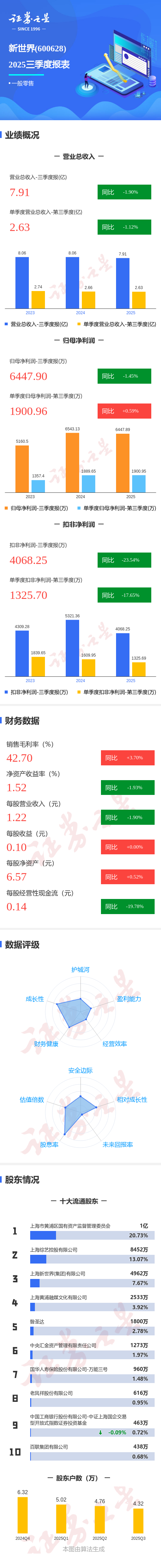 证券之星消息,新世界2025年三季报显示,前三季度公司主营收入7.91亿元,同比下降1.9%;归母净利润6447.9万元,同比下降1.46%;扣非净利润4068.25万元,同比下降23.55%;其中2025年第三季度,公司单季度主营收入2.63亿元,同比下降1.13%;单季度归母净利润1900.96万元,同比上升0.6%;单季度扣非净利润1325.7万元,同比下降17.66%;负债率25.04%,投资收益1193.29万元,财务费用992.83万元,毛利率42.7%。