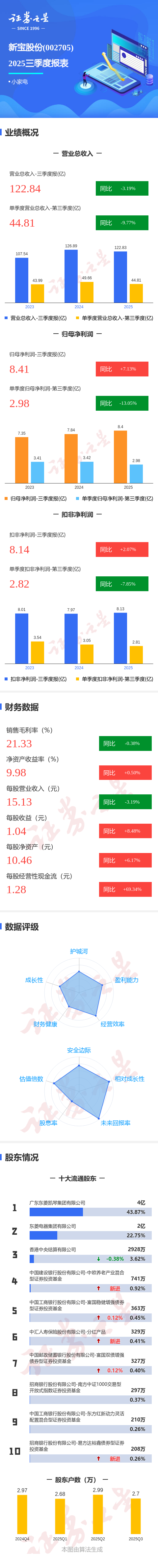证券之星消息,新宝股份2025年三季报显示,前三季度公司主营收入122.84亿元,同比下降3.2%;归母净利润8.41亿元,同比上升7.13%;扣非净利润8.14亿元,同比上升2.07%;其中2025年第三季度,公司单季度主营收入44.81亿元,同比下降9.78%;单季度归母净利润2.98亿元,同比下降13.05%;单季度扣非净利润2.82亿元,同比下降7.85%;负债率44.43%,投资收益-1625.86万元,财务费用1399.07万元,毛利率21.33%。