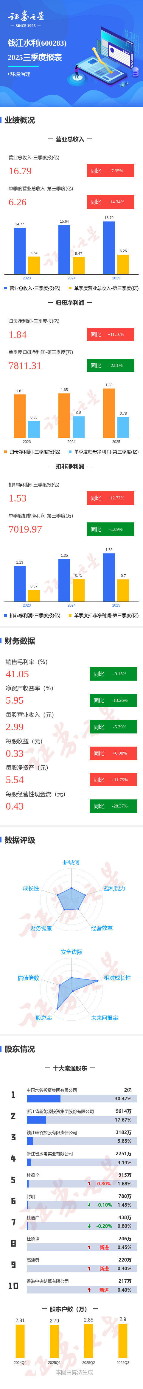 证券之星消息,钱江水利2025年三季报显示,前三季度公司主营收入16.79亿元,同比上升7.35%;归母净利润1.84亿元,同比上升11.16%;扣非净利润1.53亿元,同比上升12.77%;其中2025年第三季度,公司单季度主营收入6.26亿元,同比上升14.34%;单季度归母净利润7811.31万元,同比下降2.82%;单季度扣非净利润7019.97万元,同比下降1.89%;负债率60.71%,投资收益2409.01万元,财务费用5488.76万元,毛利率41.05%。