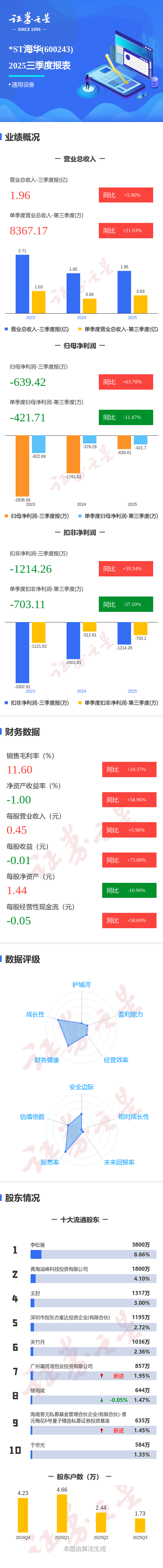 证券之星消息,*ST海华2025年三季报显示,前三季度公司主营收入1.96亿元,同比上升5.96%;归母净利润-639.42万元,同比上升63.71%;扣非净利润-1214.26万元,同比上升39.35%;其中2025年第三季度,公司单季度主营收入8367.17万元,同比上升21.94%;单季度归母净利润-421.71万元,同比下降11.48%;单季度扣非净利润-703.11万元,同比下降37.11%;负债率33.44%,投资收益22.04万元,财务费用-17.83万元,毛利率11.6%。