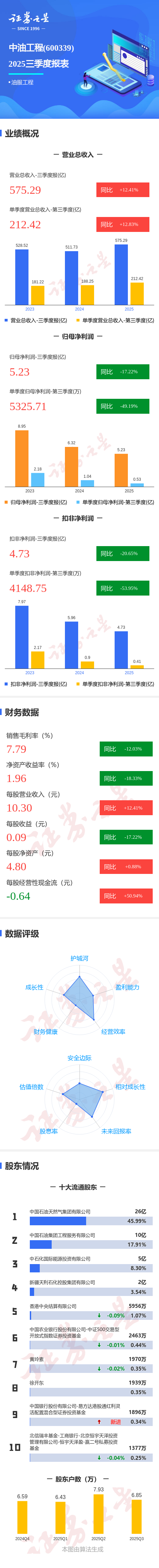 证券之星消息,中油工程2025年三季报显示,前三季度公司主营收入575.29亿元,同比上升12.42%;归母净利润5.23亿元,同比下降17.22%;扣非净利润4.73亿元,同比下降20.65%;其中2025年第三季度,公司单季度主营收入212.42亿元,同比上升12.84%;单季度归母净利润5325.71万元,同比下降49.19%;单季度扣非净利润4148.75万元,同比下降53.96%;负债率78.38%,投资收益673.62万元,财务费用1.63亿元,毛利率7.79%。