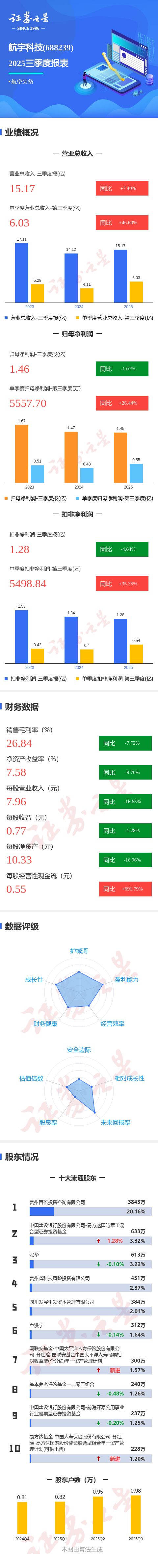 证券之星消息,航宇科技2025年三季报显示,前三季度公司主营收入15.17亿元,同比上升7.4%;归母净利润1.46亿元,同比下降1.07%;扣非净利润1.28亿元,同比下降4.65%;其中2025年第三季度,公司单季度主营收入6.03亿元,同比上升46.6%;单季度归母净利润5557.7万元,同比上升26.45%;单季度扣非净利润5498.84万元,同比上升35.35%;负债率57.86%,投资收益17.5万元,财务费用1994.58万元,毛利率26.84%。