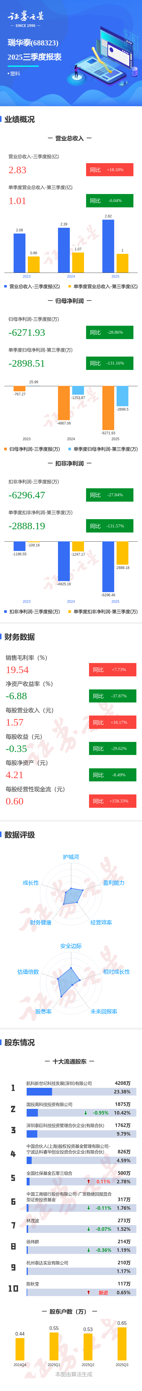 证券之星消息,瑞华泰2025年三季报显示,前三季度公司主营收入2.83亿元,同比上升18.18%;归母净利润-6271.93万元,同比下降28.86%;扣非净利润-6296.47万元,同比下降27.84%;其中2025年第三季度,公司单季度主营收入1.01亿元,同比下降6.05%;单季度归母净利润-2898.51万元,同比下降131.16%;单季度扣非净利润-2888.19万元,同比下降131.58%;负债率65.42%,投资收益-316.86万元,财务费用3999.25万元,毛利率19.54%。