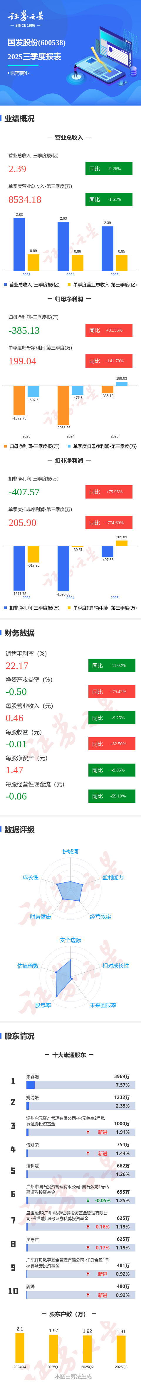 证券之星消息,国发股份2025年三季报显示,前三季度公司主营收入2.39亿元,同比下降9.26%;归母净利润-385.13万元,同比上升81.56%;扣非净利润-407.57万元,同比上升75.96%;其中2025年第三季度,公司单季度主营收入8534.18万元,同比下降1.61%;单季度归母净利润199.04万元,同比上升141.7%;单季度扣非净利润205.9万元,同比上升774.69%;负债率18.57%,投资收益1240.8万元,财务费用104.59万元,毛利率22.17%。