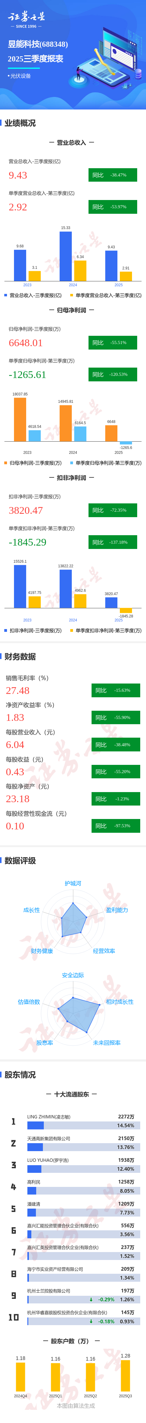 证券之星消息,昱能科技2025年三季报显示,前三季度公司主营收入9.43亿元,同比下降38.48%;归母净利润6648.01万元,同比下降55.52%;扣非净利润3820.47万元,同比下降72.36%;其中2025年第三季度,公司单季度主营收入2.92亿元,同比下降53.98%;单季度归母净利润-1265.61万元,同比下降120.53%;单季度扣非净利润-1845.29万元,同比下降137.18%;负债率19.97%,投资收益1258.53万元,财务费用-8685.3万元,毛利率27.48%。